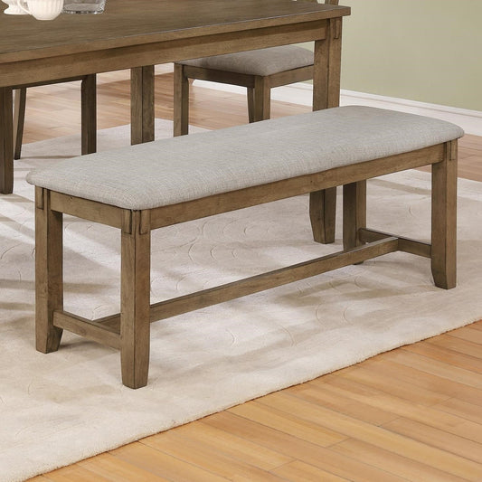 This dining bench features an upholstered seat in a leather like material. Finished wood makes...