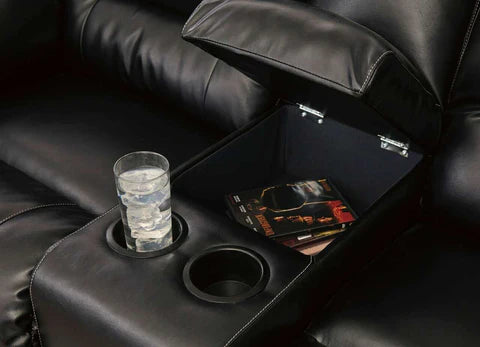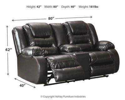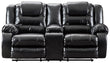 When it comes to comfort, style and value, the Vacherie faux leather reclining sofa and reclining loveseat in black rocks. Tailored for feel-good flair, its fashion-forward bustle back design is enhanced with sculpted padding on the headrest for cradling support. Channel cushioning along the sides flows into thick, wrapped pillowtop armrests that are truly over the top. And while it might look like you broke the bank, a sumptuously soft leather-like fabric keeps indulgence well within budget.
