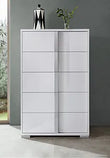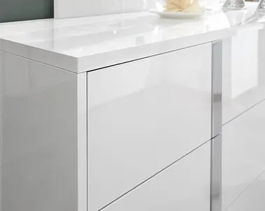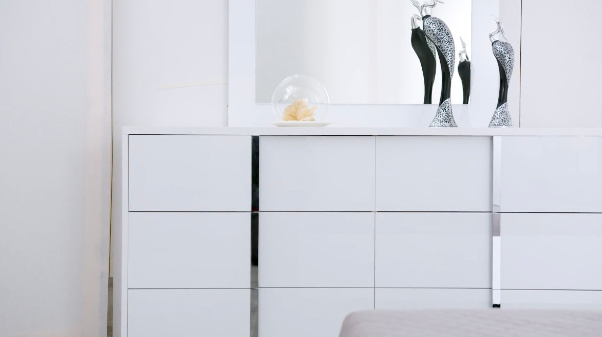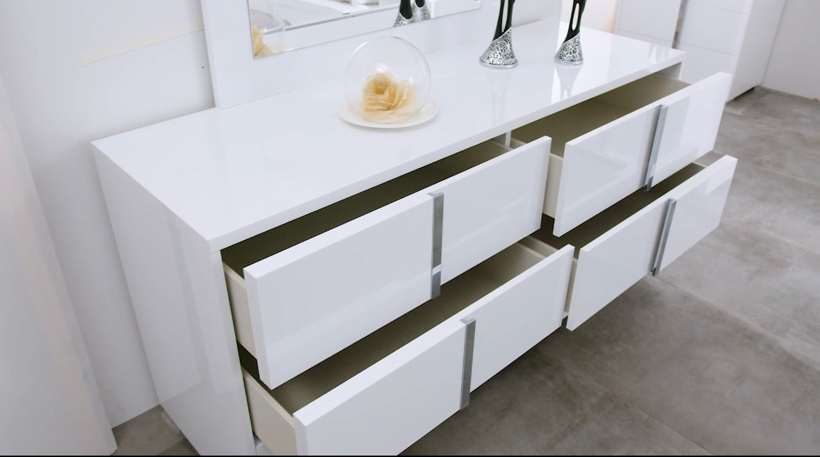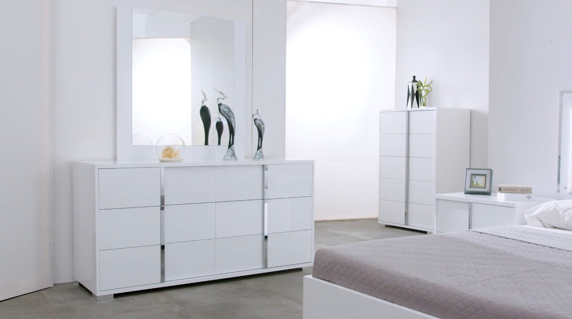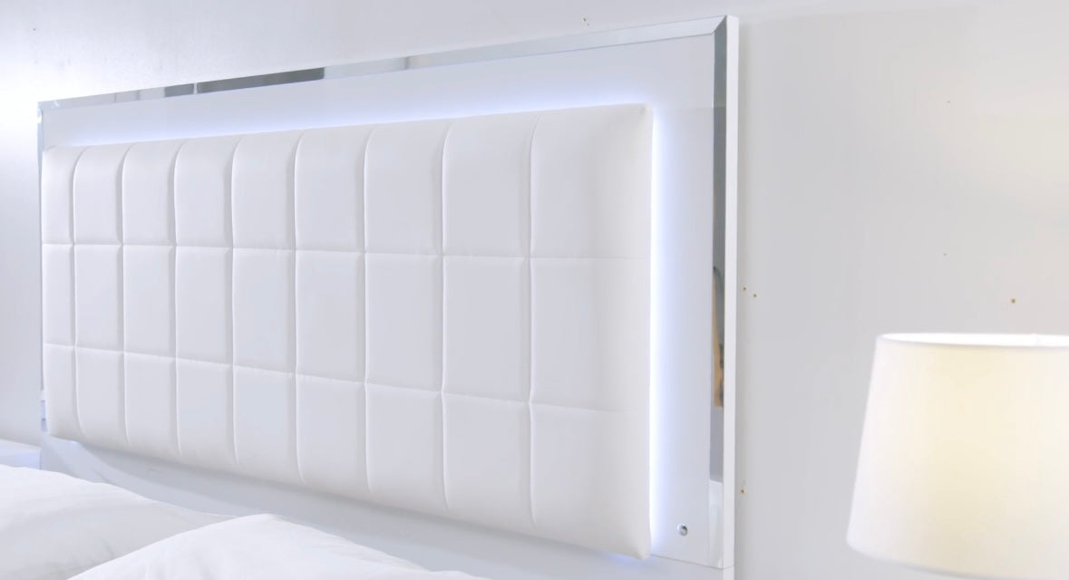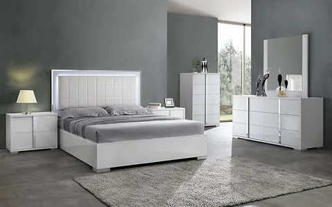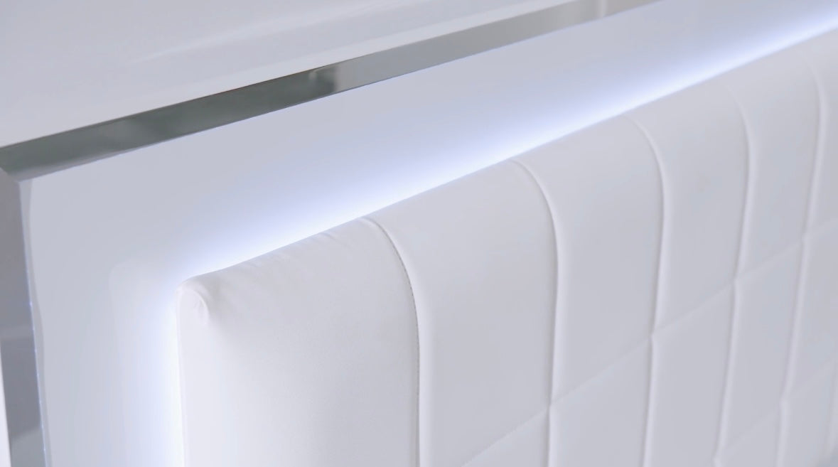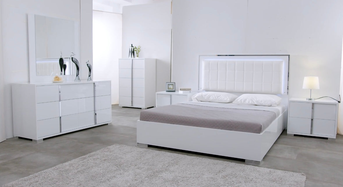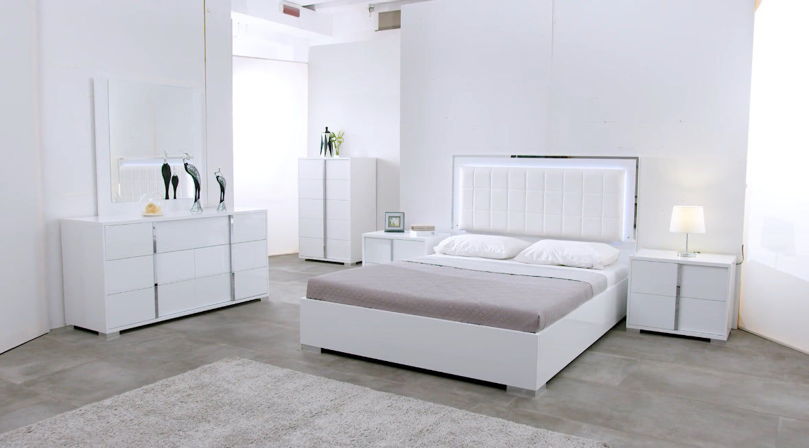 This modern Beverly bedroom set is sure to be the perfect addition to any bedroom. The white gloss finish is complemented with chrome handles and a faux leather padded headboard with LED light. Soft closing drawers on the nightstand, chest, and dresser provide added convenience. The platform bed gives this set a modern look that is sure to be a conversation starter.