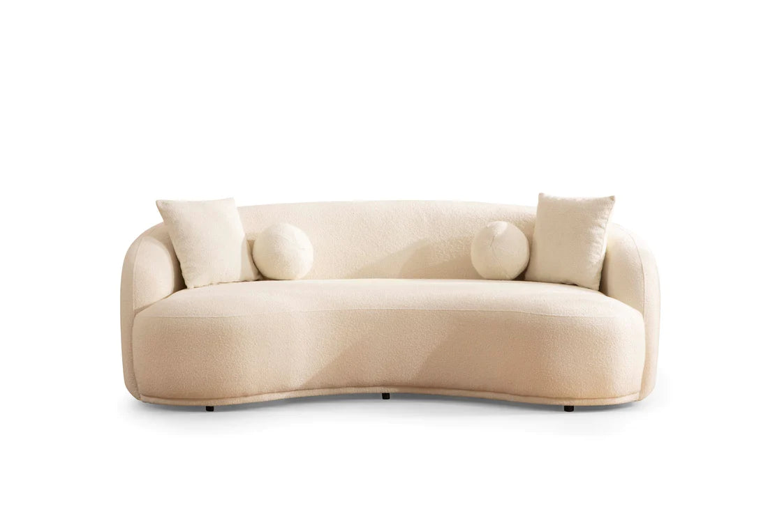 Introducing our Bonita Boucle Sofa Loveseat Set, a perfect combination of style and comfort. Crafted with the utmost attention to detail, this set features luxurious boucle upholstery, known for its softness and texture. The stunning curved structure of this sofa loveseat set adds a touch of elegance to any room. The Ivory color for this set is carefully selected to provide a minimal yet post-modern look. This set features four square pillows and three round pillows, creating a delightful balance of shapes and coziness.