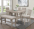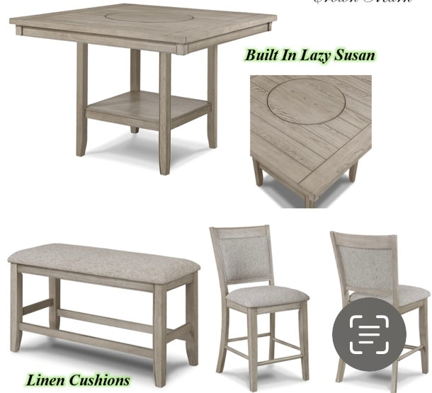 The Fulton grey counter height set is by Crown Mark. The Fulton set will add style and function to your dining room area. The table features a built in lazy susan and is finished in a grey finish. The table also feature a built in shelf for additional functionality. The counter stools and bench are covered in a grey-brown linen fabric.