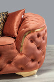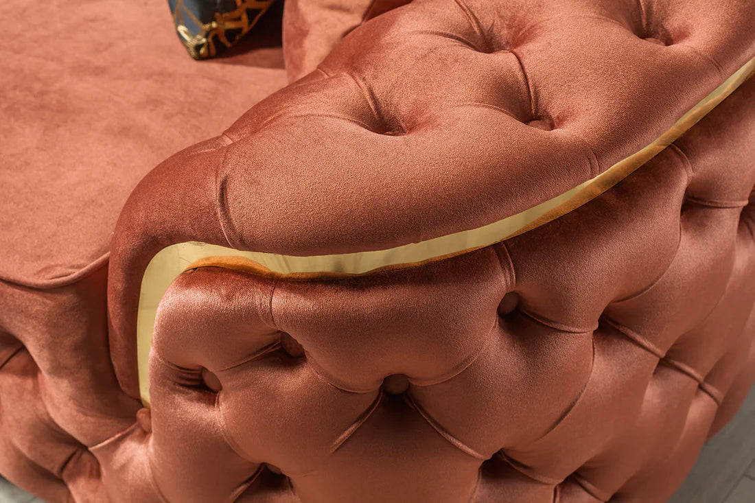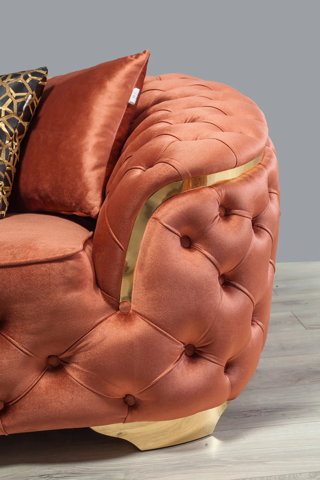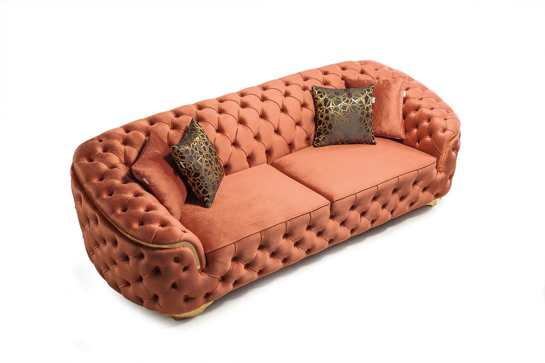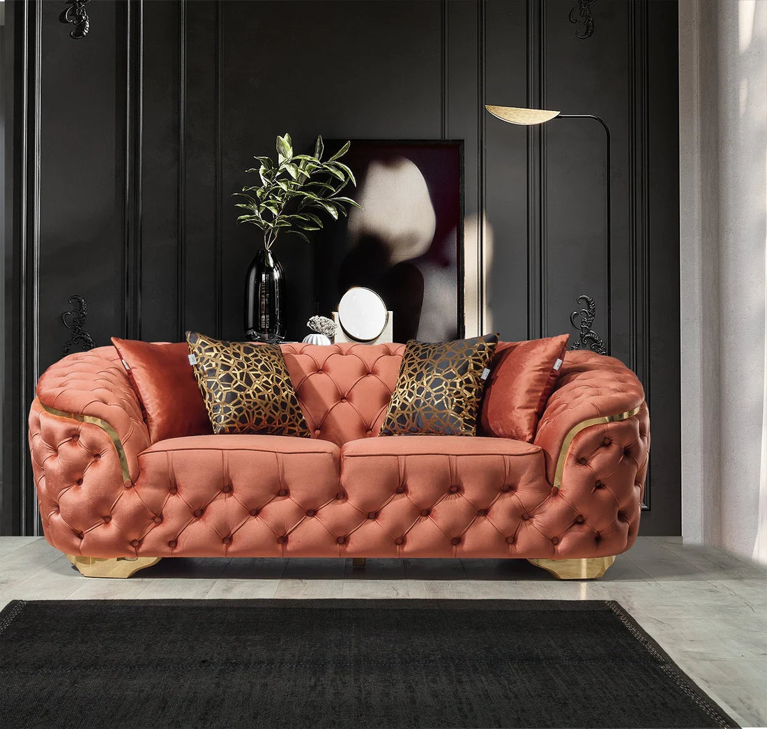 Introducing "Lupino," our exquisite Sofa&Loveseat set that effortlessly blends modern and classic design elements. Handmade with meticulous care, this set showcases deep tufting that adds depth and texture to its overall allure. The rich velvet upholstery enhances its luxurious appeal, while the gold details surrounding the Lupino exude an air of elegance. The solid wood legs, adorned with gold accents, provide a sophisticated foundation. With its timeless charm, this set is a perfect balance of modern aesthetics and timeless beauty. This set includes a set of 8 meticulously crafted designer pillows.