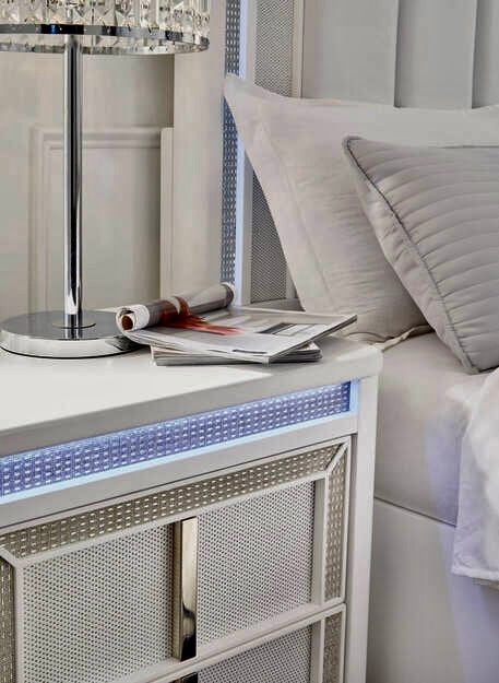 The built-in LED lighting and rhinestone-framed drawers add style and practical storage.