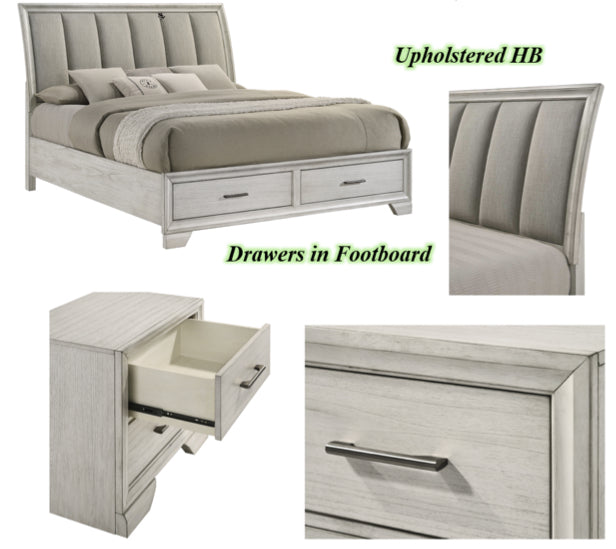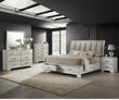 This bedroom set offers a sleek and stylish update to any space, featuring a white mist finish that commands attention while maintaining a sense of warmth and coziness. The bed stands as the stunning centerpiece, with its high, padded headboard upholstered in a plush fabric that invites relaxation and comfort. Flanking the bed are matching nightstands, providing convenient access to storage and display space. The set is rounded out with a capacious dresser, accented with a broad mirror that adds depth and brightness to the room.
